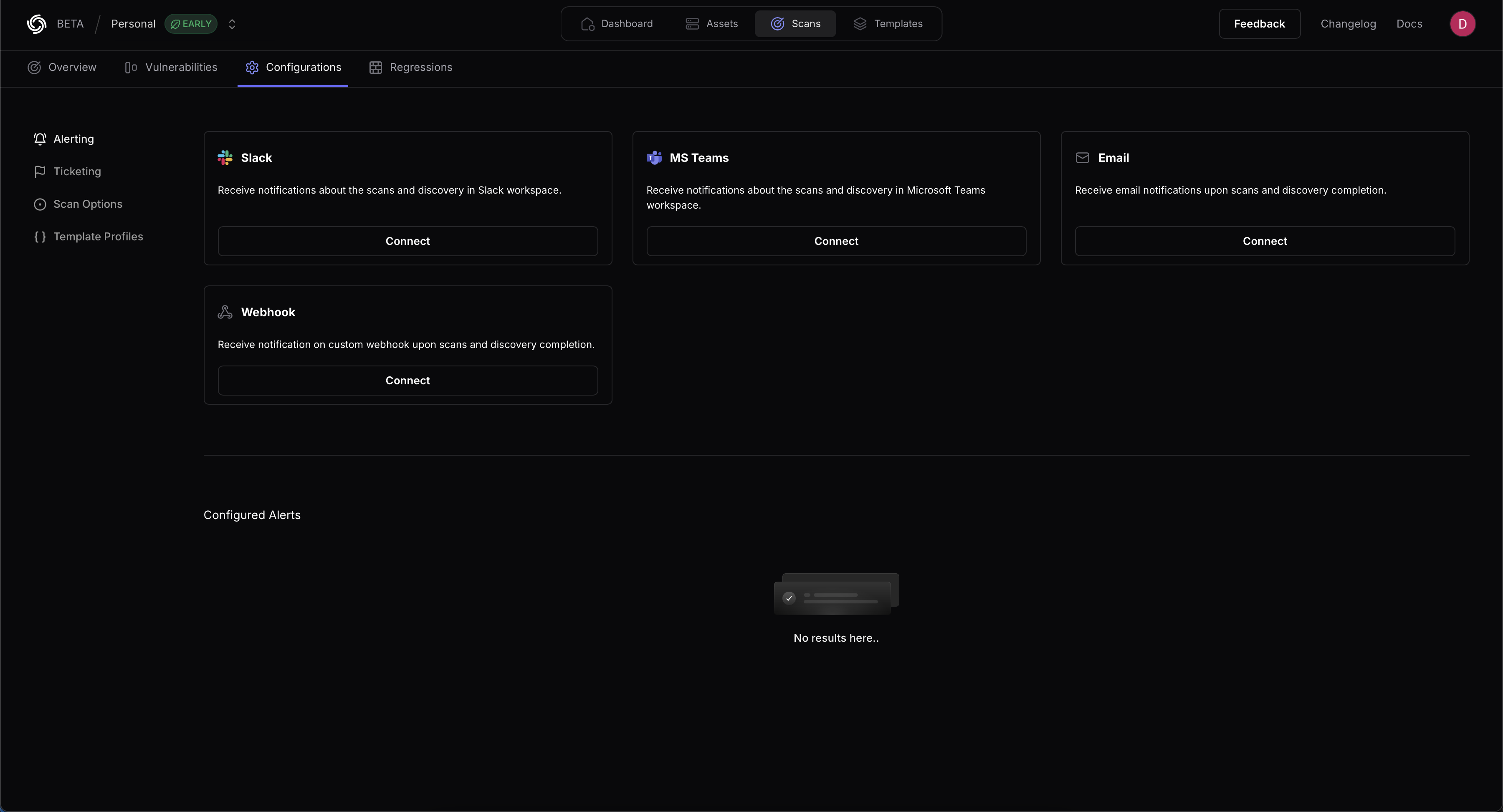 Alerting integrations support notifications as part of scanning and asset discovery, and include Slack, Microsoft Teams, Email, and custom Webhooks. Navigate to Scans → Configurations → Alerting to configure your alerts.