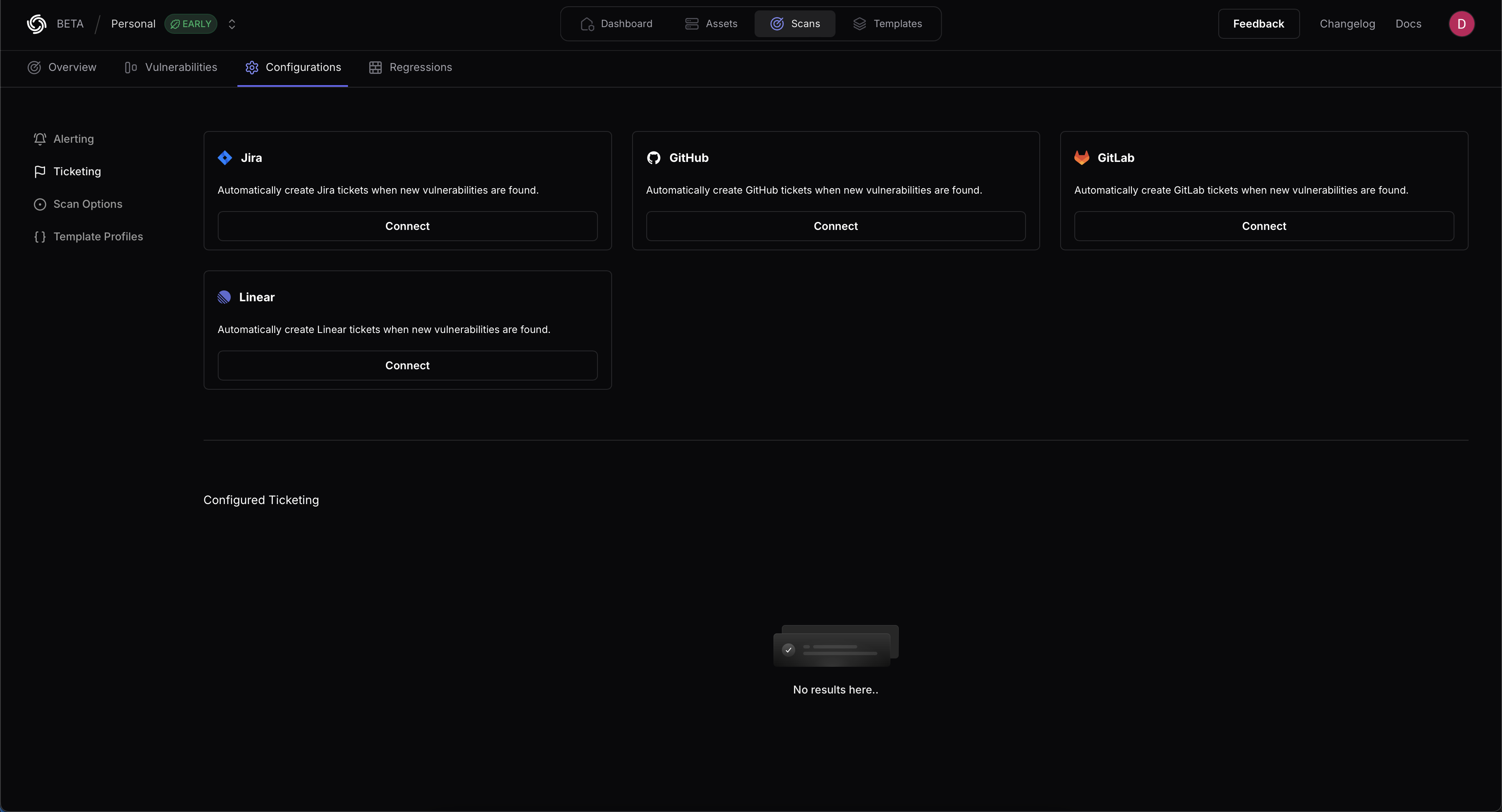The integrations under Ticketing support ticketing functionality as part of scanning and include support for Jira, GitHub, GitLab, and Linear. Navigate to Scans → Configurations → Ticketing to configure your ticketing tools.